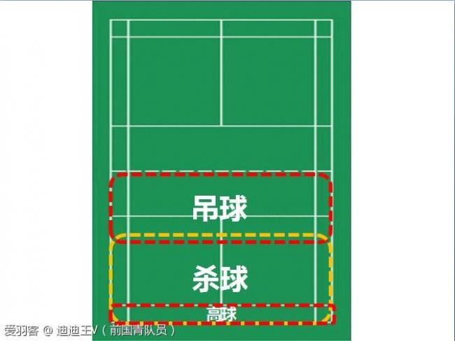 各位球友大家好,我是王迪。欢迎来到羽毛球晋级之路第二十期。在上一期的内容中,我们一起梳理了羽毛球运动后场的主要技术:高球、杀球、吊球。从球的落点区域来看,落点在前场的球基本上是吊球、落点在对方后场的球是高球,落点在中后场的球以杀球为主。(见下图)
