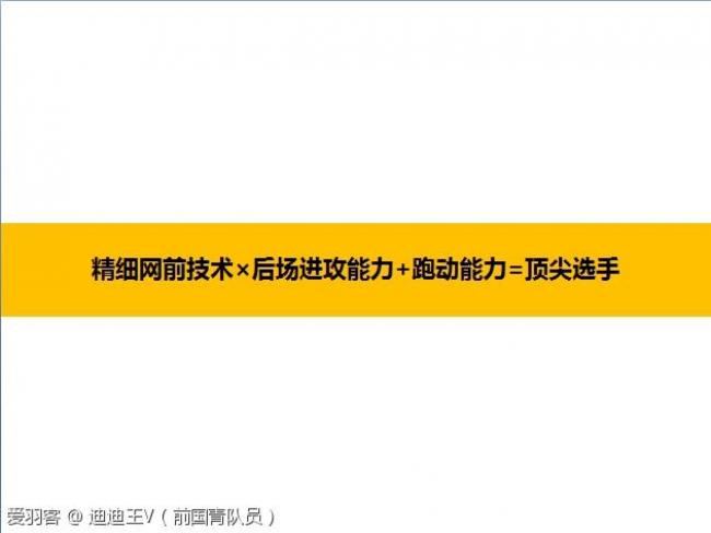 比如早期的林丹在遇到陶菲克的时候始终很难打,就是因为陶菲克出众的网前技术能够控制住场上节奏,加上后场又有一拍可以得分的重杀,又比如今年崛起的安赛龙和桃田贤斗,都是具备了细致的网前控制力,同时后场又有超强的进攻能力取得制胜分,才能够跻身顶尖选手之列,所以这里我想告诉各位一个想成为顶尖高手的迪迪王公式:(迪迪王发现的公式,全网独家)