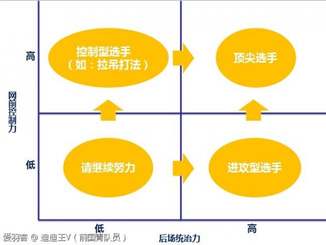 1、网前控制力高、后场统治力高。如果你处于这个区域,则已经具备了成为顶尖选手的条件;这里讨论的是技能层面的问题,需要努力的方向是:学会如何使用这些技能,学会在合适的时候使用合适的技能,也就是战术、思维、心理层面的提升。比如认真看迪迪王的羽毛球晋级之路系列文章。