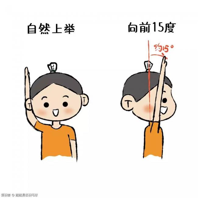 1、找准击球点。这个击球点即手自然上举后向前15度就是击球点, 就是正常高球的击球点。手臂稍稍弯曲便于自己发力(因为完全伸直肘是无法发力的)。