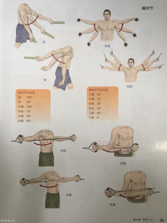肩部是组合关节,故动作是由大臂动作和锁骨动作组合而成的,在实际挥拍过程中,肩部需要完成三个方向的动作,展肩收肩(缩骨屈伸)、降肩抬肩(锁骨升降)、外旋内旋。