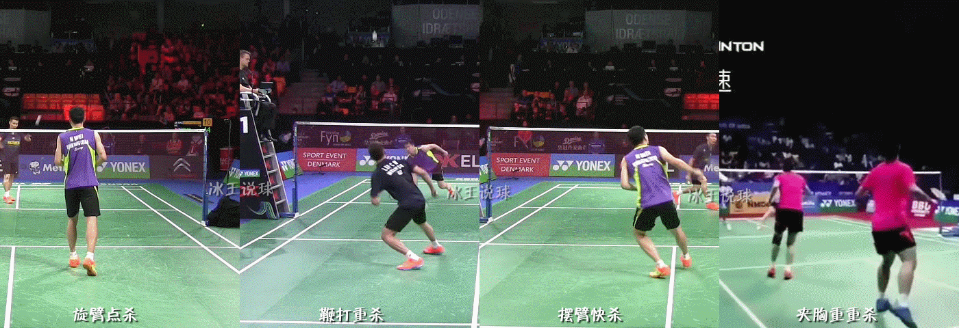 下图中四个杀球分别以不同的肩部和手臂动作为主(依次为:旋臂、顶肘旋臂、摆臂、夹胸),会因此产生不同的效果。