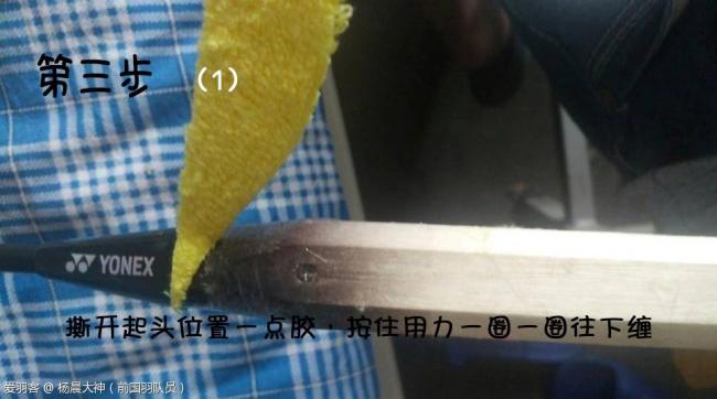 3.我的习惯是从锥盖下方起头,喜欢双打的球友从锥盖顶端开始也没问题的,看个人习惯,需要注意的是开头扯的时候要用点力,不然会皱。
