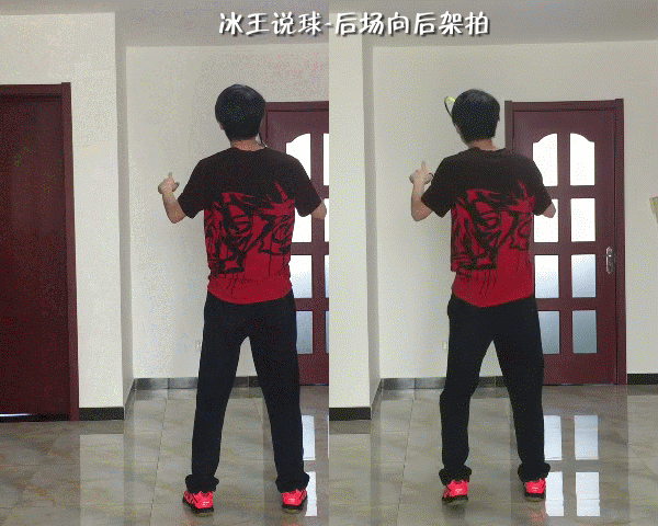 所以后场的架拍动作是第一时间把肘部打开指向后方,以配合步法的移动,或者说给身体一个向后的信号,此时拍头逐渐向上,指向来球。