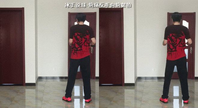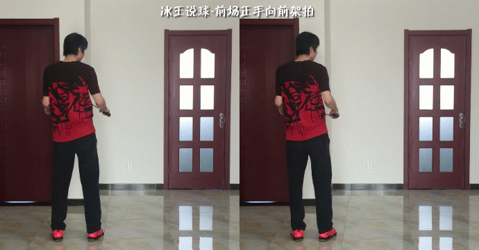 前场的架拍也是一样,第一时间把肘部打开指向前方,以配合步法的移动,或者说给身体一个向前的信号,此时拍头逐渐向前,指向来球,抢点高的时候,抬肘会高,被动低点时,肘部会适当降低。