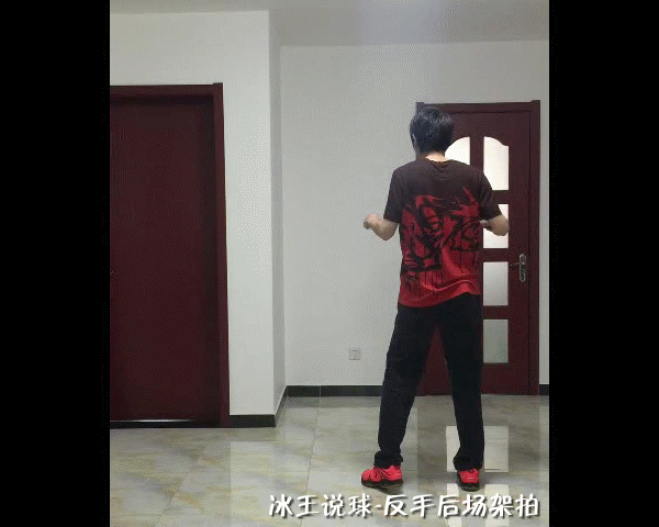 反手后场架拍,拍头不需要指向来球,只需要肘部指引身体转身即可。