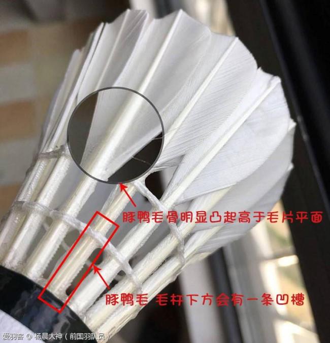 豚鸭的羽毛和鹚鸪鸭很接近,不容易分辨,很多无良商家会把豚鸭毛和鹚鸪鸭毛掺在一起卖,从此也就有了鹚豚不分家之说,豚鸭毛杆弯拱度大一些,毛骨明显凸起高于平面,毛杆下方会有一条凹槽,同样厚薄大小,豚鸭也相对重一些,不过稳定性不好,打球容易下雪花