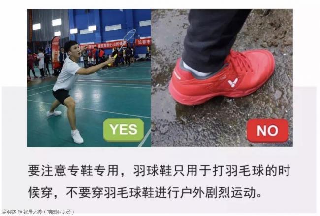 要注意专鞋专用,羽毛球鞋只能在羽毛球专业场地上穿,不要穿着羽毛球鞋在户外踏山涉水,不仅会对鞋底有很严重的损伤,还会导致鞋底氧化颜色加深变硬,鞋底一旦氧化就会失去抓地防滑功能,在球场上很容易摔倒受伤,代表着球鞋彻底报废。