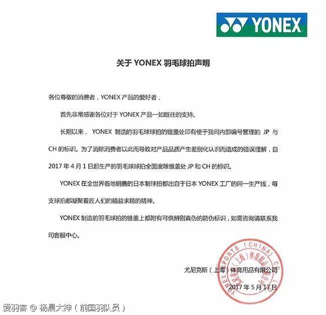 关于这个事情在2017年YONEX公司已经公开做出声明,并废除了JP、CH标识。