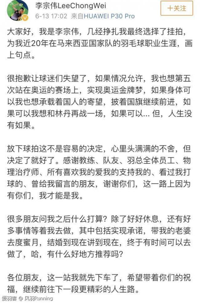 或许这一次为了我的家庭,需要停下里歇一歇了,是时候退役了......那些期望我再次回到赛场的人,那些一直默默支持我的球迷,还有整个马来西亚,我恐怕要让他们失望了......对不起