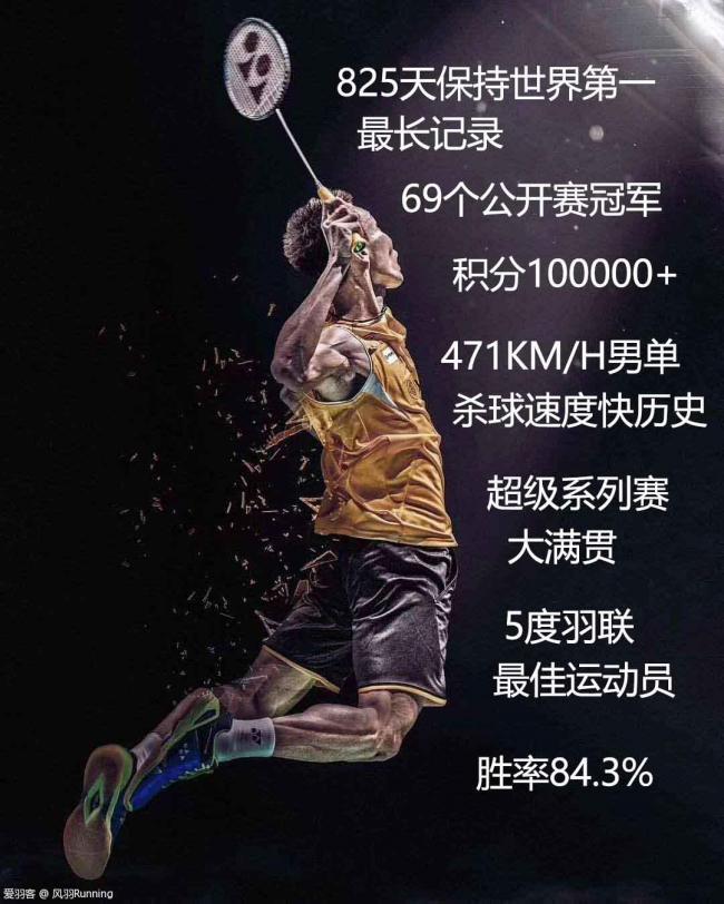 #论成绩,连续825天保持世界第一最长选手,69个公开赛冠军,积分破十万,417km/h男单最快杀球速度,超级系列赛大满贯 -- 全球12站,羽联年度最佳羽球运动员 -- 5 度,胜率84.3%(近50年来只逊于林丹的87.4%)除了林丹和谌龙,其他对手他都保持近乎完胜的记录