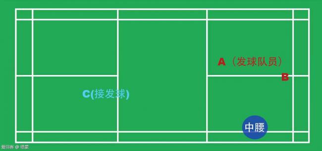 双打比赛中,接发球环节有个重要的技术叫:拨中腰。就是把对手发到前场的球,轻轻推到对方的中场边线位置。如图:AB是搭档,A发球,C接发后直接把球打到蓝色“中腰”位置。