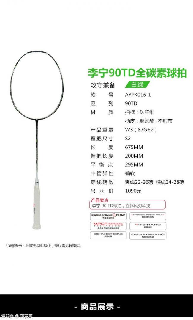 出全新正品李宁90TD球拍一支,吊牌价1090元。今年8月9日实体店购买,25-27磅YY65首线,无暇。因不匹配本人打法,450元出(约四折),包邮。有意者请留言。
