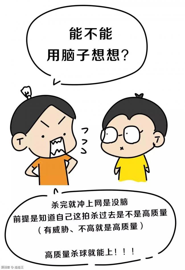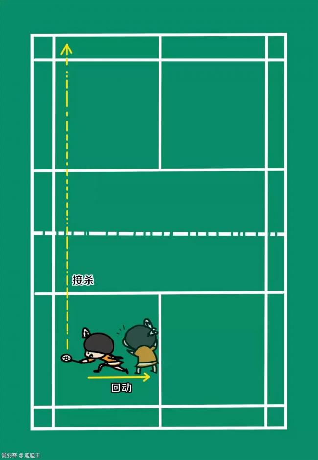 走位解说:和回了高球后的道理相似,在杀直线后,因为我们是比较主动的下压球,所以对方回出的球路会比较有限,我们可以在杀球后快速往斜前方垫小一步(预防对方接杀勾对角),在确认对方会挡出直线球后快速跟网抢网。