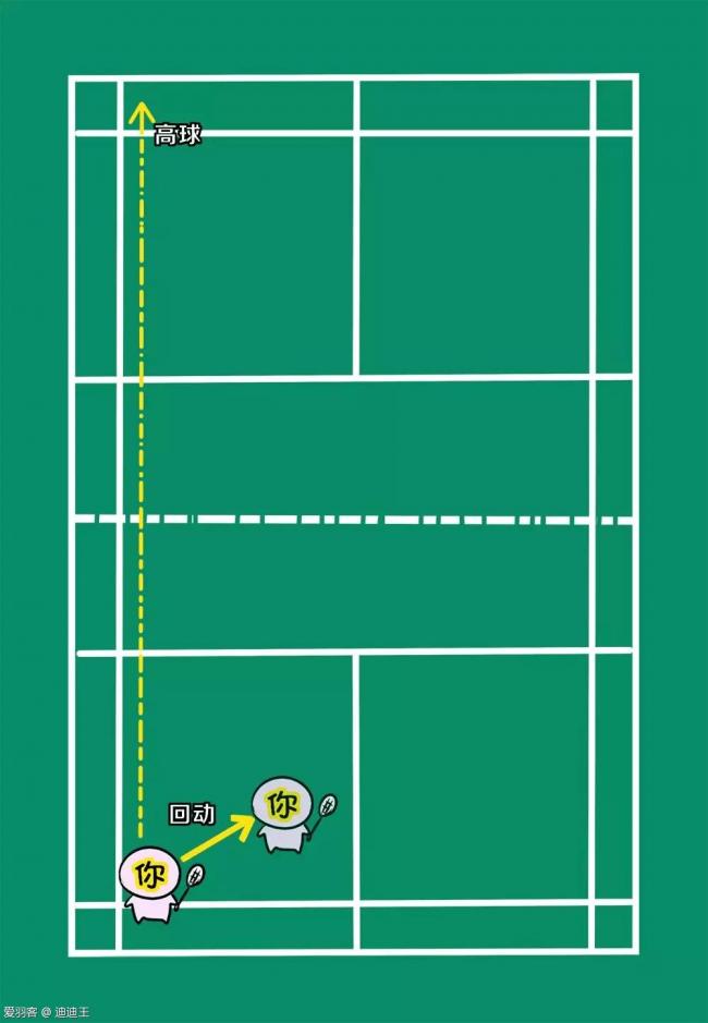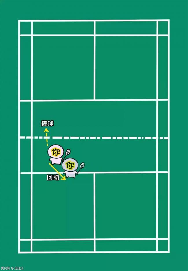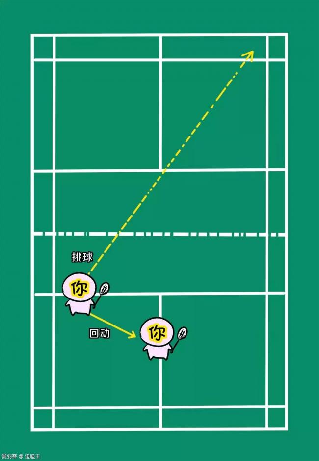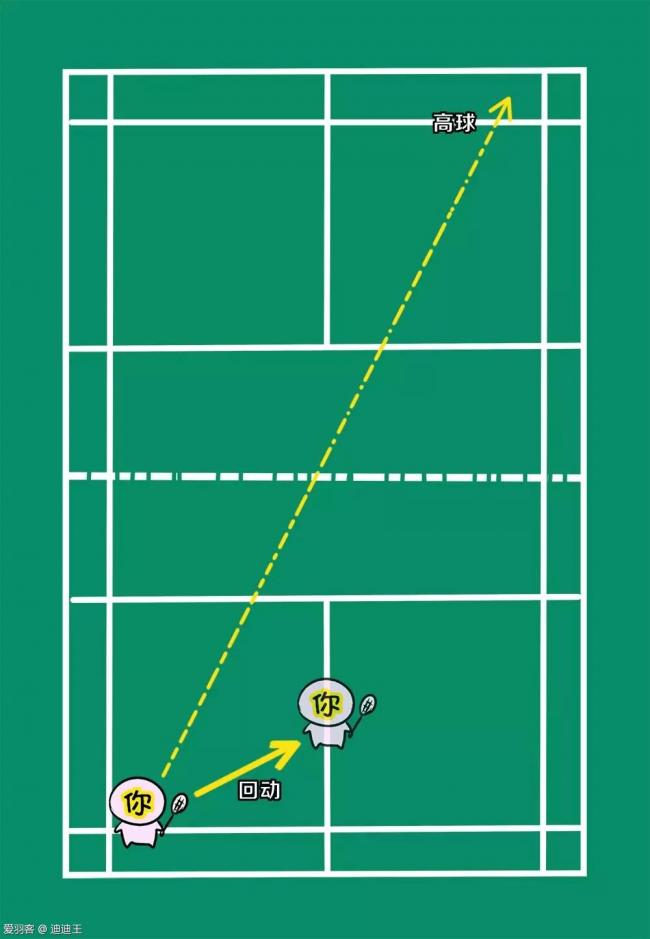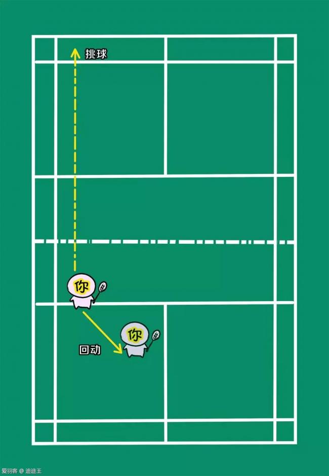 走位解说:在回对方斜线高球后,需要你回动到中心,跟着球移动,重点提防对方回直线的吊球和后场球,在回了斜线高球后保护住对方会造成较大威胁的直线球路一侧。