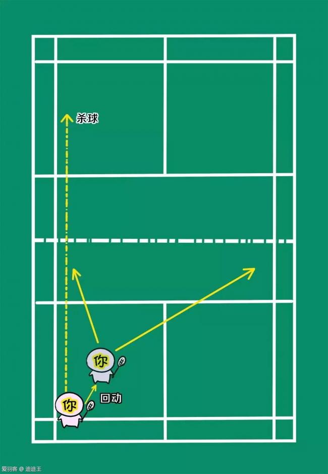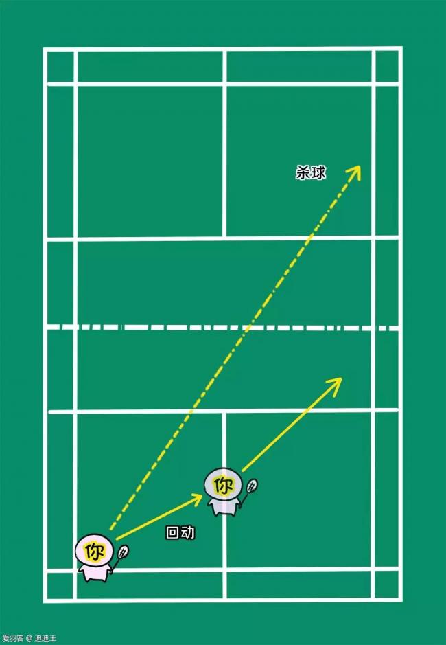 走位解说:在杀斜线后,我们需要快速跟进到中场,这是因为杀球会导致对方被动回球,被动回球大概率会是直线球路,这是因为在被动的情况下直线球更好处理。而当我们快速跟进到中场,就更容易能够抢到这种网前球,从而形成得分的机会。