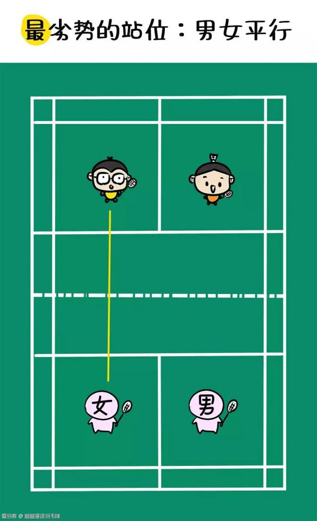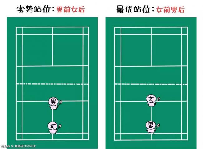 混双中的劣势站位男前女后、优势站位男后女前两种站位是一个互相颠倒的关系,也就是说,通过轮转的方法我们是可以完成男女生位置的互换的。