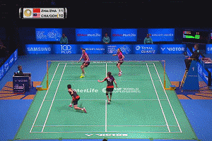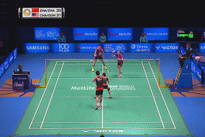 当对方继续选择挑球到后场时,女生一定不要再管后场球,直接向前移动去守网,男生要快速移动补后面这个挑球。