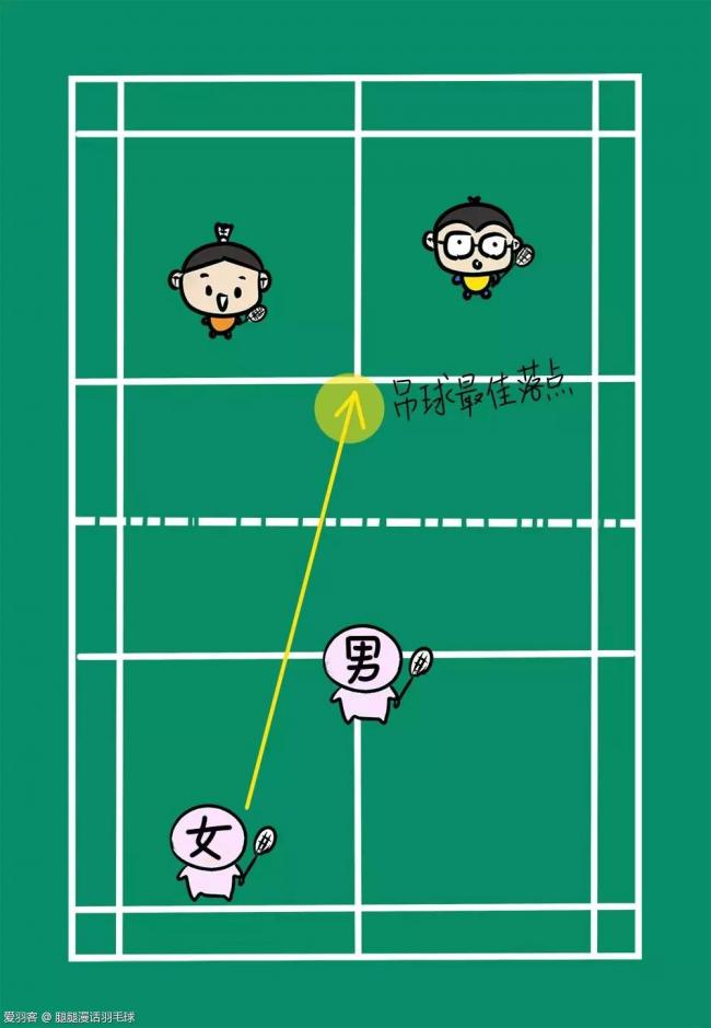 当对方继续想通过挑球把女生限制在后场时,女生可以直接跟进上网站住前场,不再管后场球,这时候男生顺势轮转到后场,就很自然拿到后场高球,并完成了女生和搭档的轮转站位。
