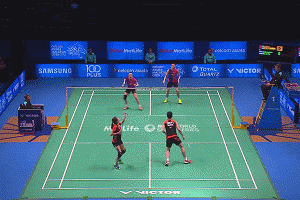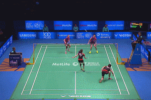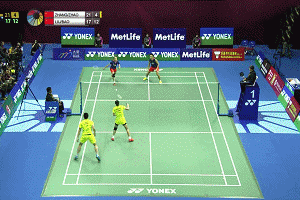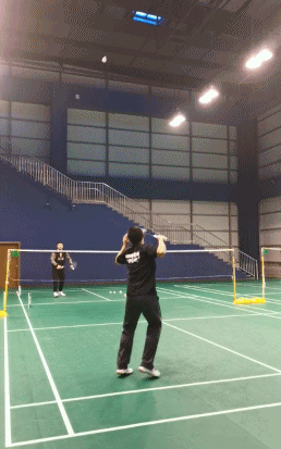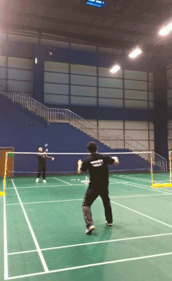女生在吊球之后就可直接往前场快速移动,迅速站位到前场的位置,在女生吊球跟进的同时,男生跟随女生的移动节奏,反向移动到后场,站住中后场的位置。