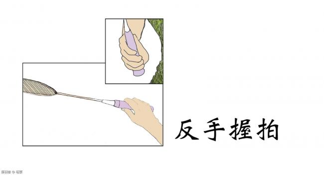 一、 反手发球要用反手握拍的姿势,如图,反手握拍发球的关键是拇指前顶发力、击球: