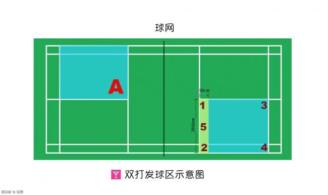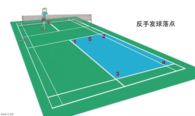 图中蓝色区域为双打接发球区,其中的1、2、5号位球为前场球,3、4号位为后场球,反手将球发到3、4号位就是通常说的“偷后场”。
