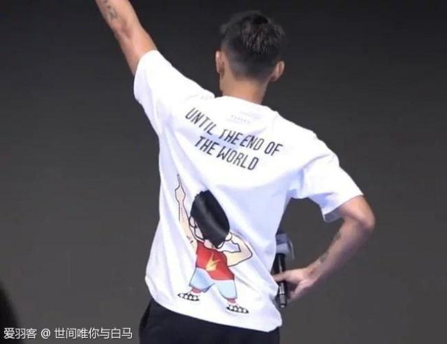 林丹身穿妻子设计的体恤参加上海的一次活动,这件T恤的元素还是比较简单,不过背后的英语还是极具意义,我们可以看到林丹背后T恤上印着:until the end of the world(直到世界尽头),可以看出,妻子对于退役后的林丹,也是想两人一起走到尽头,白头偕老。
