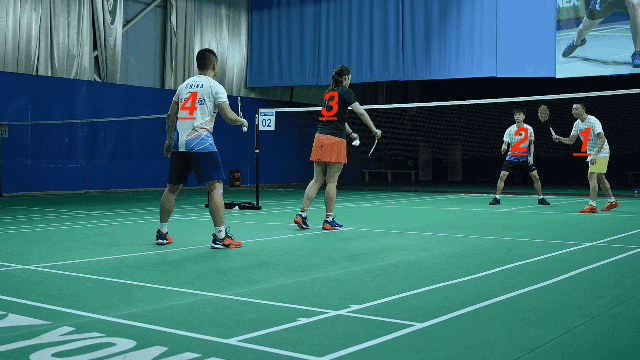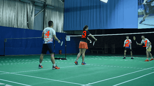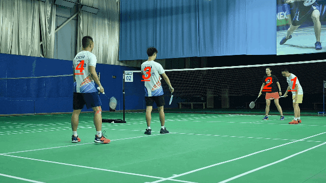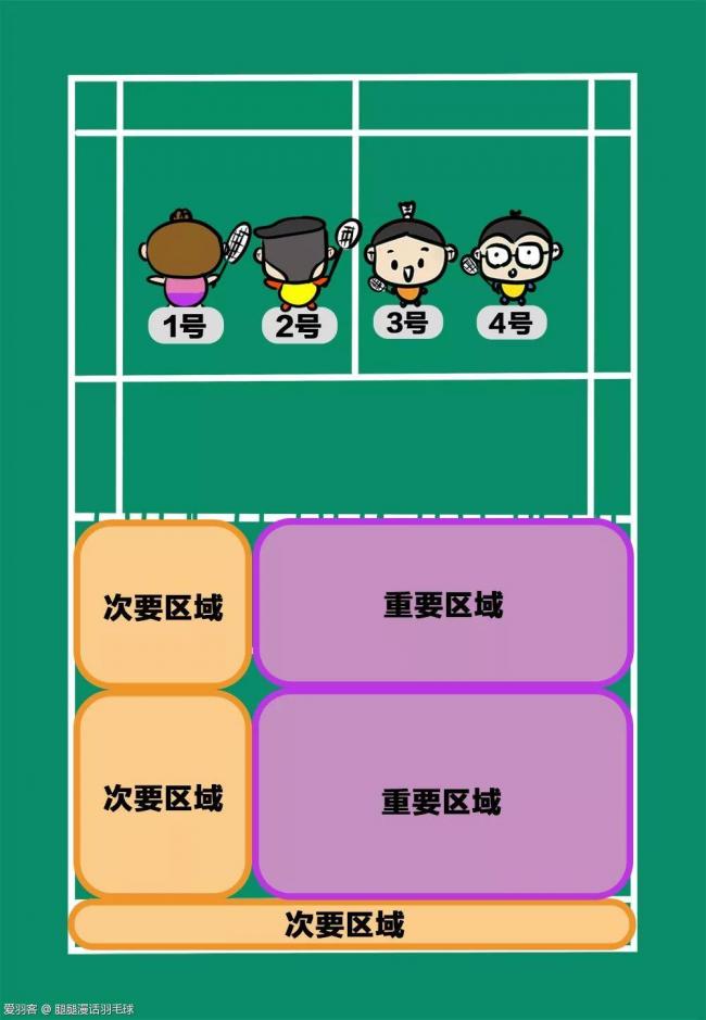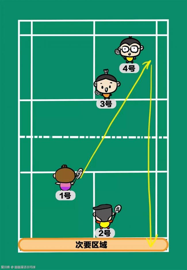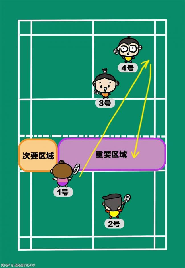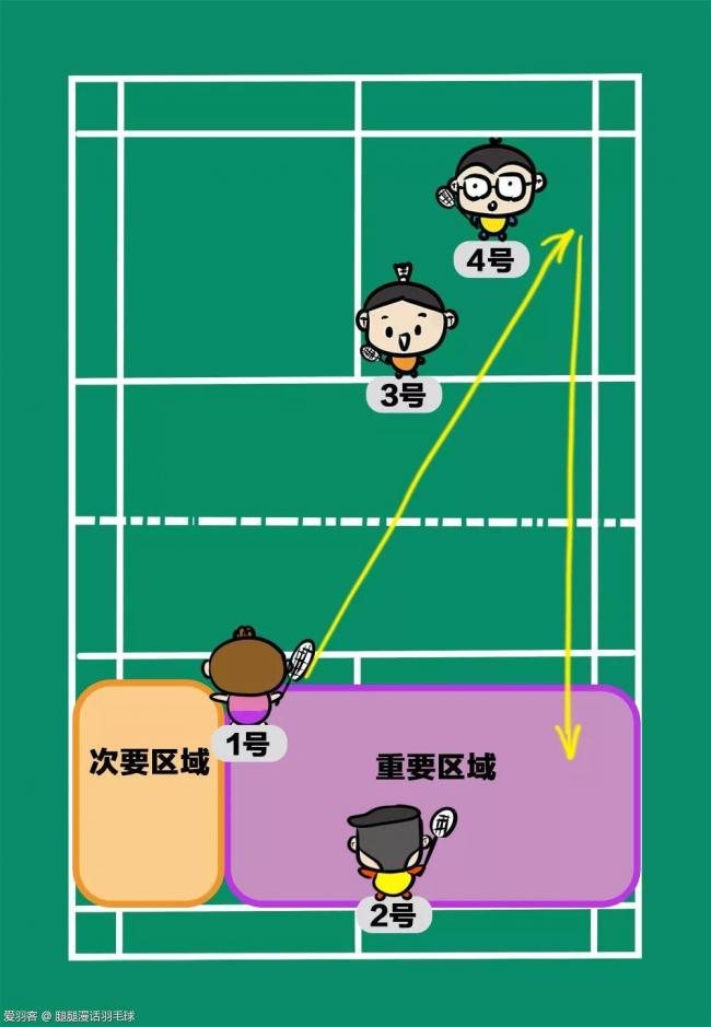 看上图,4号所在单数区域的边线网前如果要打1号对角,由于距离较长、且球会经过1号,4号处理起来难度比较高,所以1号在准备的时候可以把这里视作次要区域。