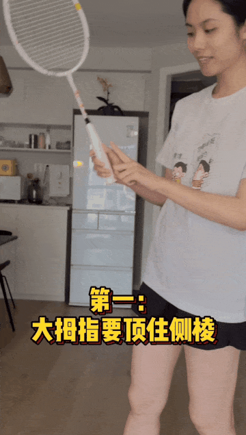 1、反手高远球握拍大拇指顶在侧棱上面,就是窄面和宽面交接的位置