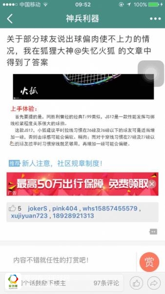 杀球:本来以为挥速那么快的球拍杀球会飘,实战中却是出乎意料的稳,对就是稳定,由于是标准拍框,容错率提高,相对于兄弟js10,即使击球稍微偏离甜区,偶尔没打得那么准的时候,出球也并没有出现什么问题。由于T头和拍头的破风结构,在重杀时有种刀子划过纸张的声音,在风中呼啸而带有怒吼,喜欢杀球的球友一定会爱上这种声音。