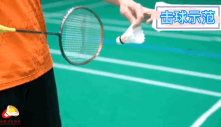 :持球手把羽毛球的羽毛稍稍往后扣,让球保持平行,正对自己,拍面切着球头发出去,尽量做到击球后让球托先出去的运动效果。