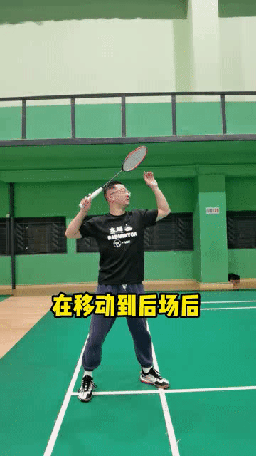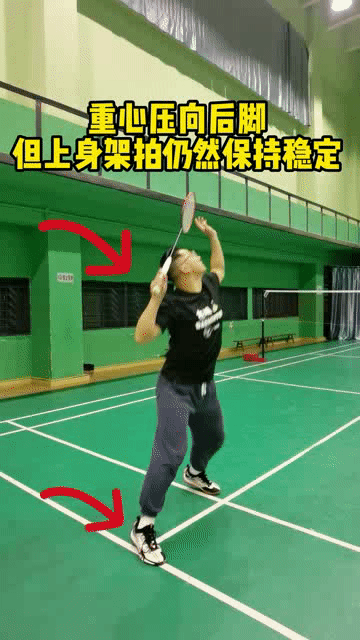 当我们快速移动到后场后,保持侧身、双脚同肩宽的站位,前脚掌蹬地、后脚跟抬起,同时做好架拍动作,准备击球。