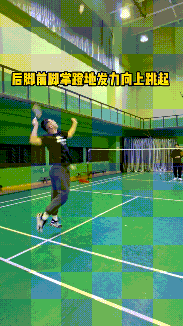 注意,在剪刀跳击球落地后,切忌不要身体后仰,而应该落地后,后脚前脚掌蹬地,立即向前回动做好下一拍球的准备。