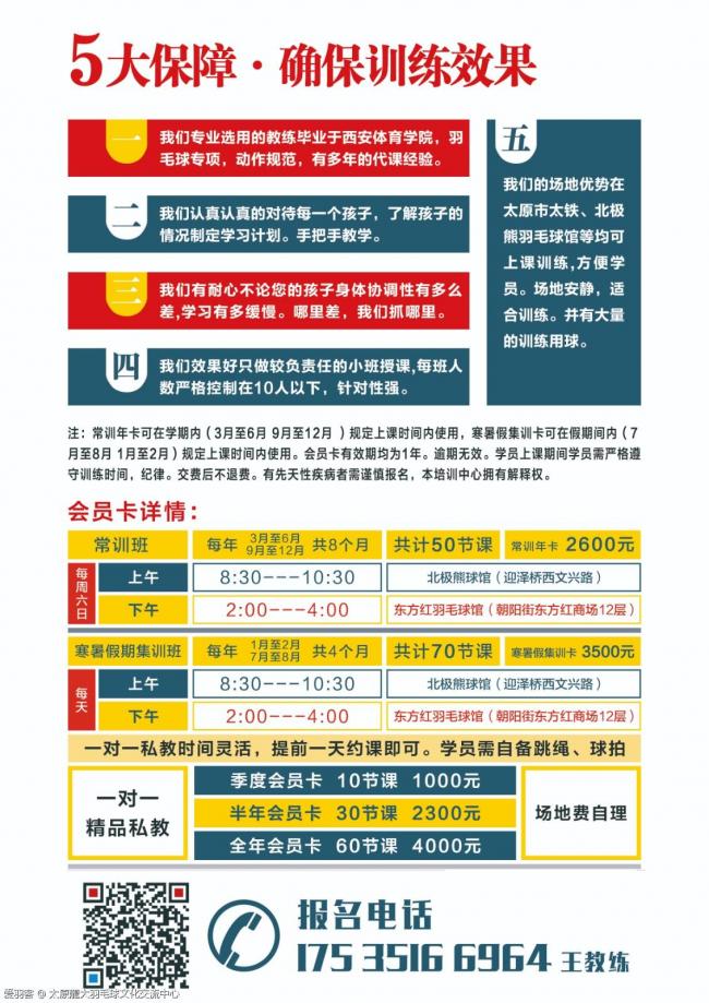 我们的优势:1 我们专业 选用的教练毕业于西安体育学院,羽毛球专项,动作规范,有多年的代课经验。2 我们认真 认真的对待每一个孩子,了解孩子的情况制定学习计划。手把手教学。3 我们有耐心。不论您的孩子身体协调性有多么差,学习有多缓慢。哪里差,我们抓哪里。4我们的场地优势,在太原市太铁、北极熊羽毛球馆等均可上课训练,方便学员。场地安静,适合训练。并有大量的训练用球。4 我们效果好 只做较负责任的小班授课,根据人数情况增加助理教练授课,针对性强。