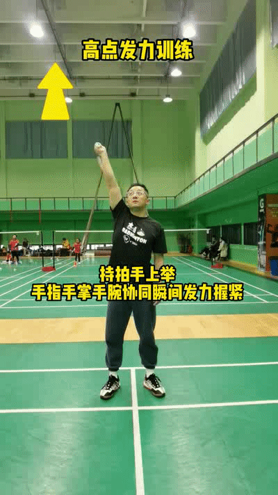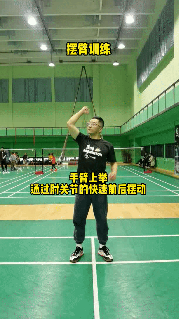 持拍手上举,通过肘关节的前后快速摆动,小空间内产生向前的惯性,手指手腕借助这一惯性,就能够在加速度的基础上完成击球,提升杀球的速度。