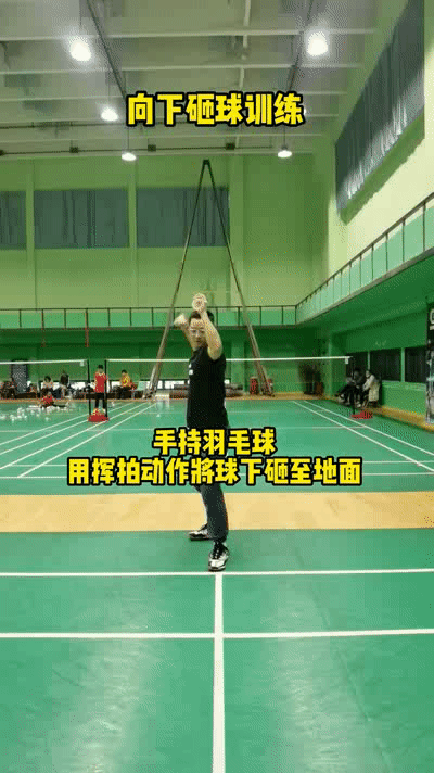 手持羽毛球,用挥拍发力的动作向前方一米左右的地面砸球,在砸球的过程中,注意要借助身体的惯性向下发力,在出手时,手上要模拟真实击球的感觉加速发力。