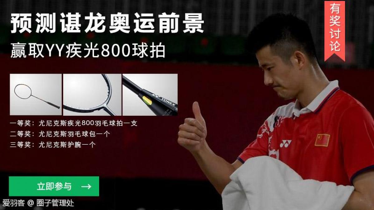 在本文评论区发表你的精彩看法(字数20字以上、观点鲜明、正能量、图文并茂尤佳),前瞻谌龙奥运前景,即有机会赢取尤尼克斯赞助的疾光800羽毛球拍、羽毛球包、护腕。