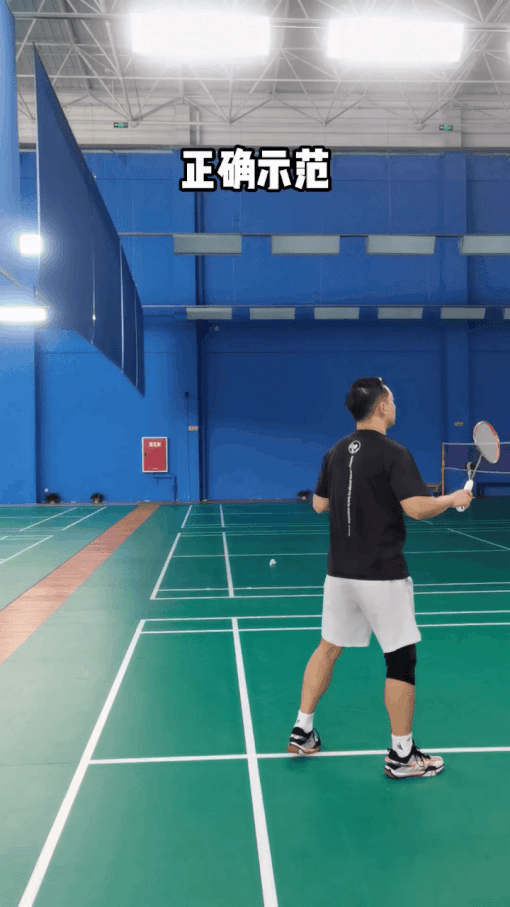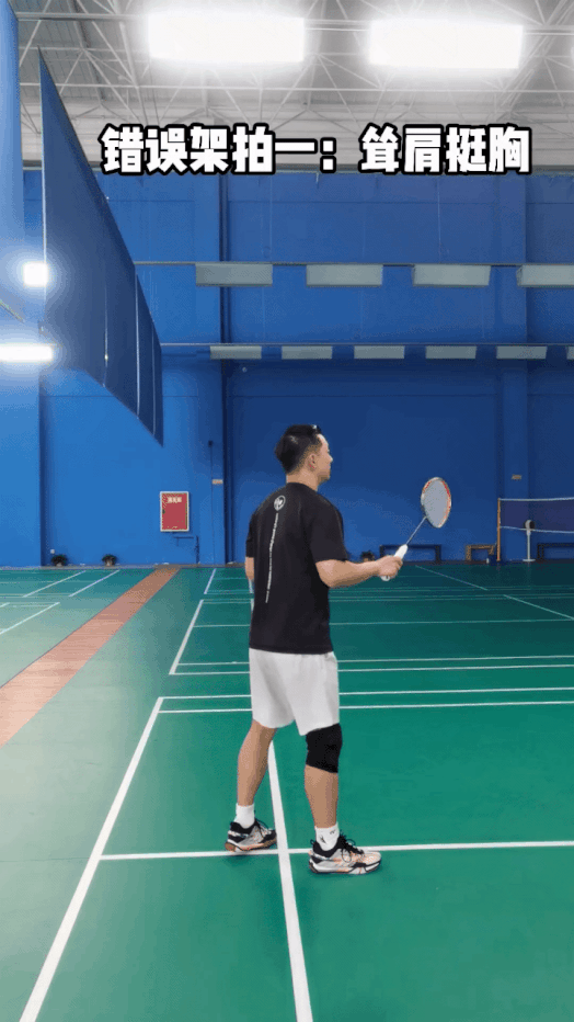 说明:耸肩挺胸是非常多爱好者容易出现的问题,这是因为大家认知上觉得打羽毛球要发力,那么我们在架拍时就要处于一个紧绷的状态,但恰恰是这种状态会妨碍我们更顺畅地发力
