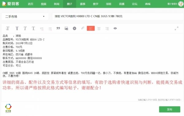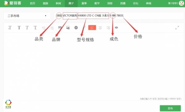 5.发帖标题必须严格遵照格式注明:品类(球拍、球鞋或者其他物品)+物品名称+成色+价格,