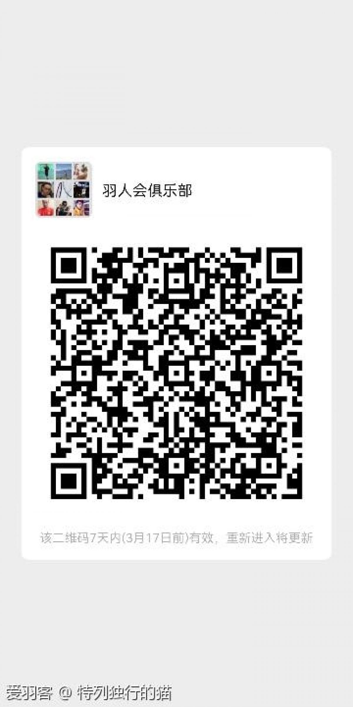 业余4.5级及以上并可经常参加群活动者,欢迎请扫码入群《羽人会俱乐部》,扫二维码无法加入的请加微信:hyq861592096并备注