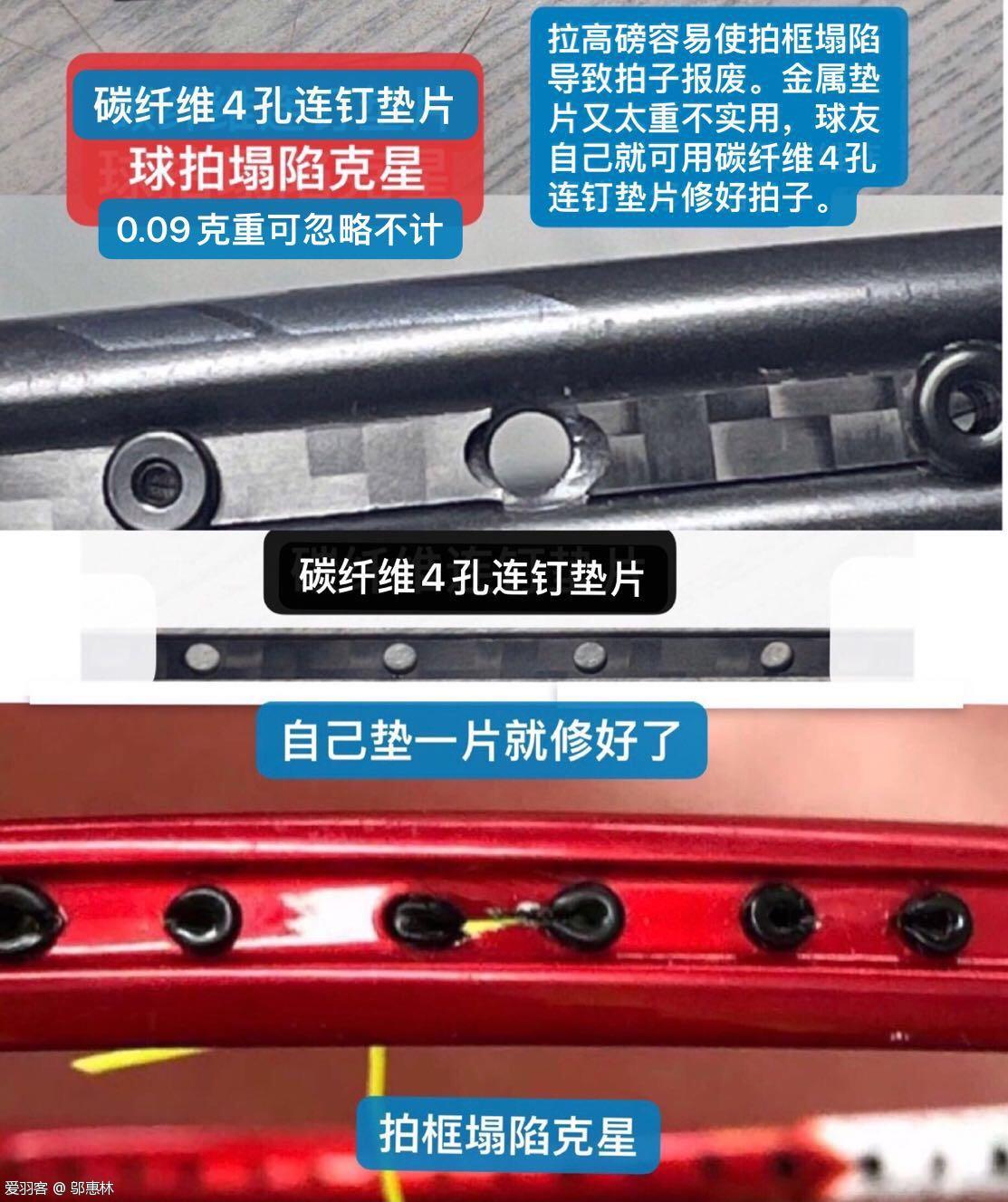 拉高磅经常使拍框塌陷,导致整支球拍报废或需要高价维修。有人采用金属垫片解救,但金属太重不实用,新研制的碳纤维4孔连钉垫片,不仅坚固耐用,而且一条仅0.09克,重量可以忽略不计,即可解救塌陷球拍。