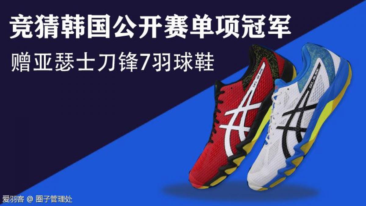 即日起参加爱羽客“竞猜韩国公开赛冠军,赢取亚瑟士球鞋!”活动,即有机会赢取亚瑟士羽毛球鞋!