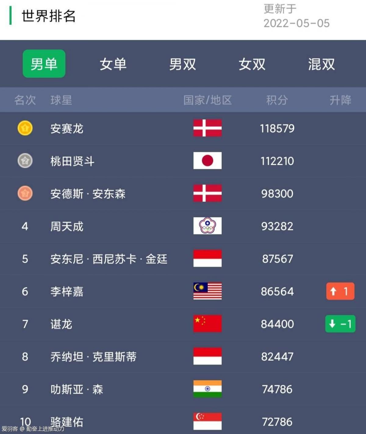 世界前10的球员有核心竞争力的为安赛龙、李梓嘉,他们近期拿了欧锦赛和亚锦赛的冠军。安赛龙已获得奥运会、世锦赛、汤姆斯杯、世界羽****决赛、全英公开赛的冠军,离集齐所有的世界冠军还差苏迪曼杯。丹麦男单有着很强的竞争力,但是男双想在苏迪曼杯比赛中打赢亚洲男双球员,难度不小;丹麦女单有米娅这样有些实力的,但是女双还不如顶尖高手,混双也是,所以我认为安赛龙在2023能获得苏迪曼杯冠军的可能性仍然很低,他一骑绝尘的比赛表现足够让自己在一个赛季获得多次冠军,丹麦羽毛球队团体能力仍有短板。安赛龙目前对他有威胁的只有李梓嘉、桃田贤斗与拉克什亚。