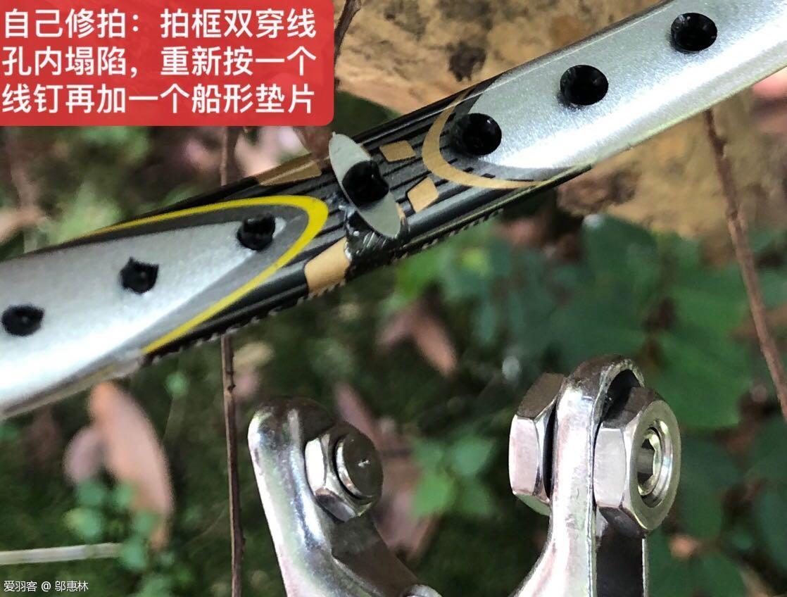 自己修拍:拍框双穿线孔内塌陷,重新按一个线钉再加一