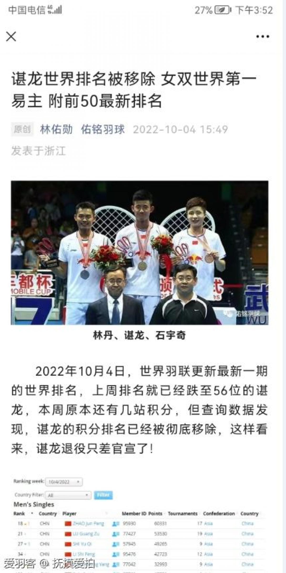 谌龙世界排名没了,要官宣退役了