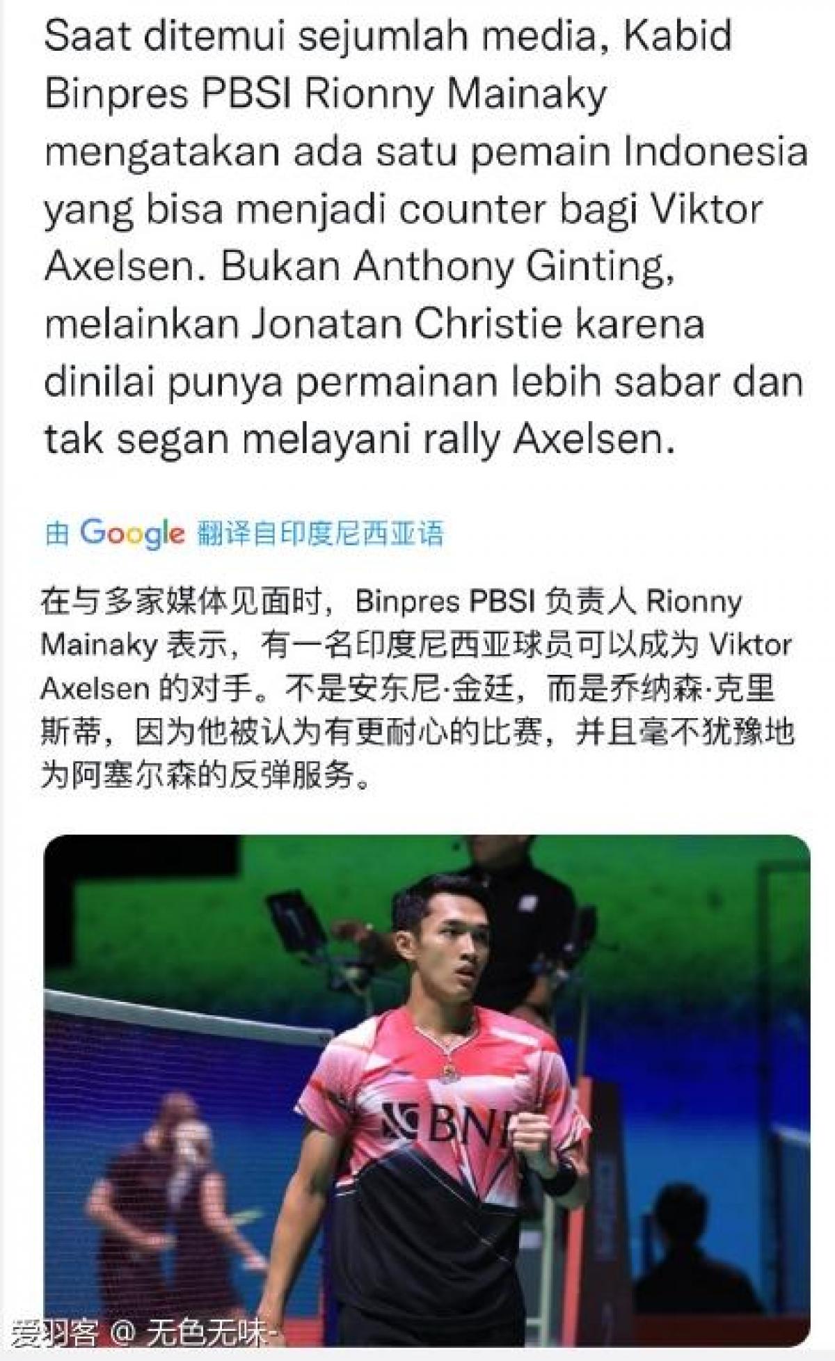 印尼羽协相关人士表示,有一位印尼球员可以成为安赛龙的对手,他不是金廷,而是乔纳坦,因为他打的更耐心,并且能防住安赛龙的进攻