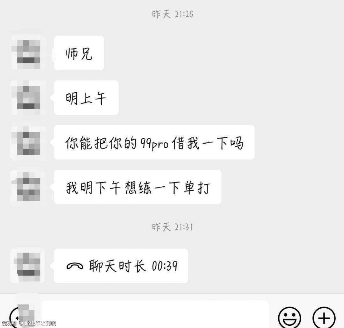 就平时打球见几次的师弟,老找我借拍,之前我在场借几次也就算了,还不停了,100zz,99pro一直拿来打。喜欢不能自己买?你要练单打不会用自己拍?让他买又不买。怎么,把我的当你的了?