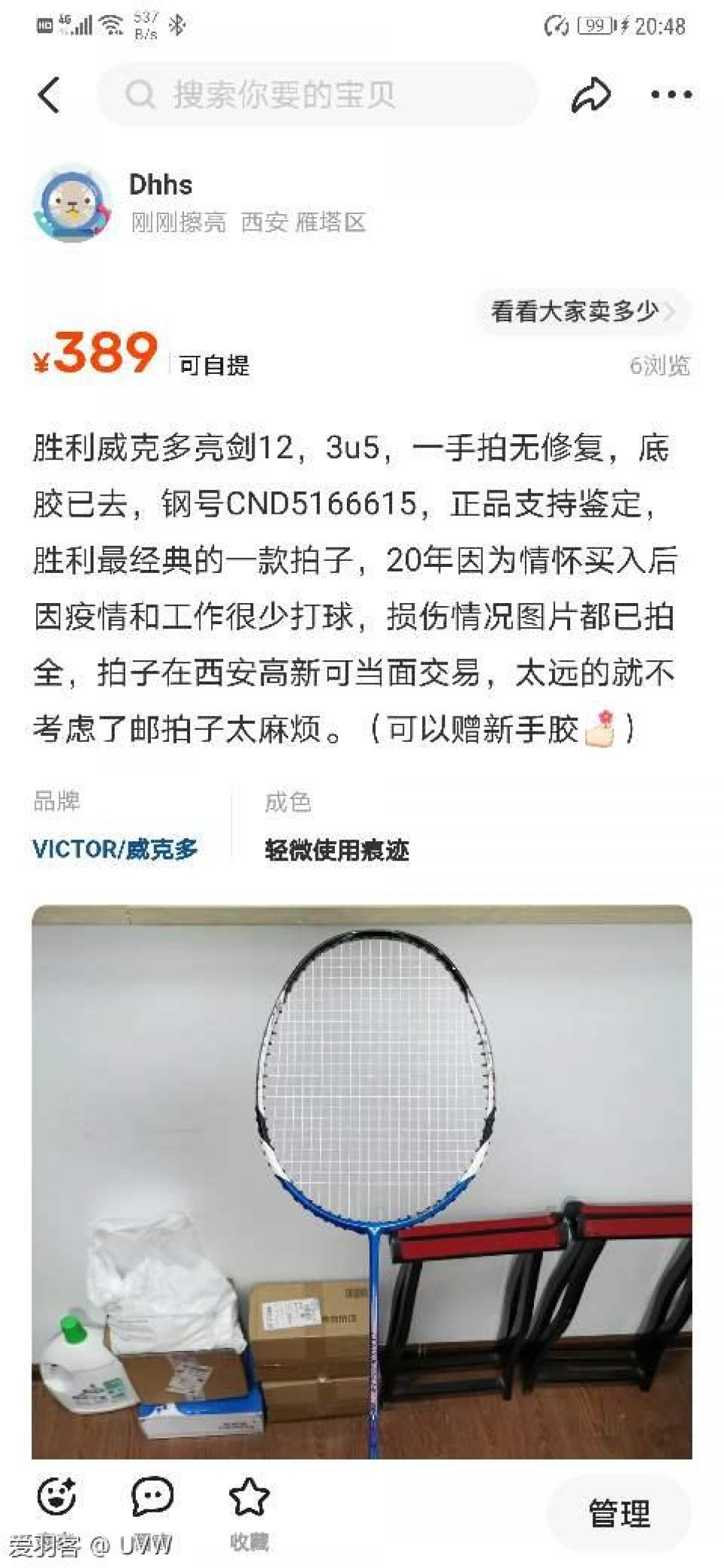 胜利威克多亮剑12,3u5,一手拍无修复,底胶已去,钢号CND5166615,正品支持鉴定,胜利最经典的一款拍子,20年因为情怀买入后因疫情和工作很少打球,损伤情况图片都已拍全,拍子在西安高新可当面交易,太远的就不考虑了邮拍子太麻烦。(可以赠新手胶)
